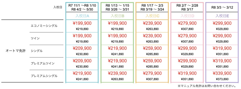 合宿免許は、受け入れ人数に上限がある定員制です。入校生が多い時期は、7月下旬〜9月上旬、2月上旬〜4月上旬です。