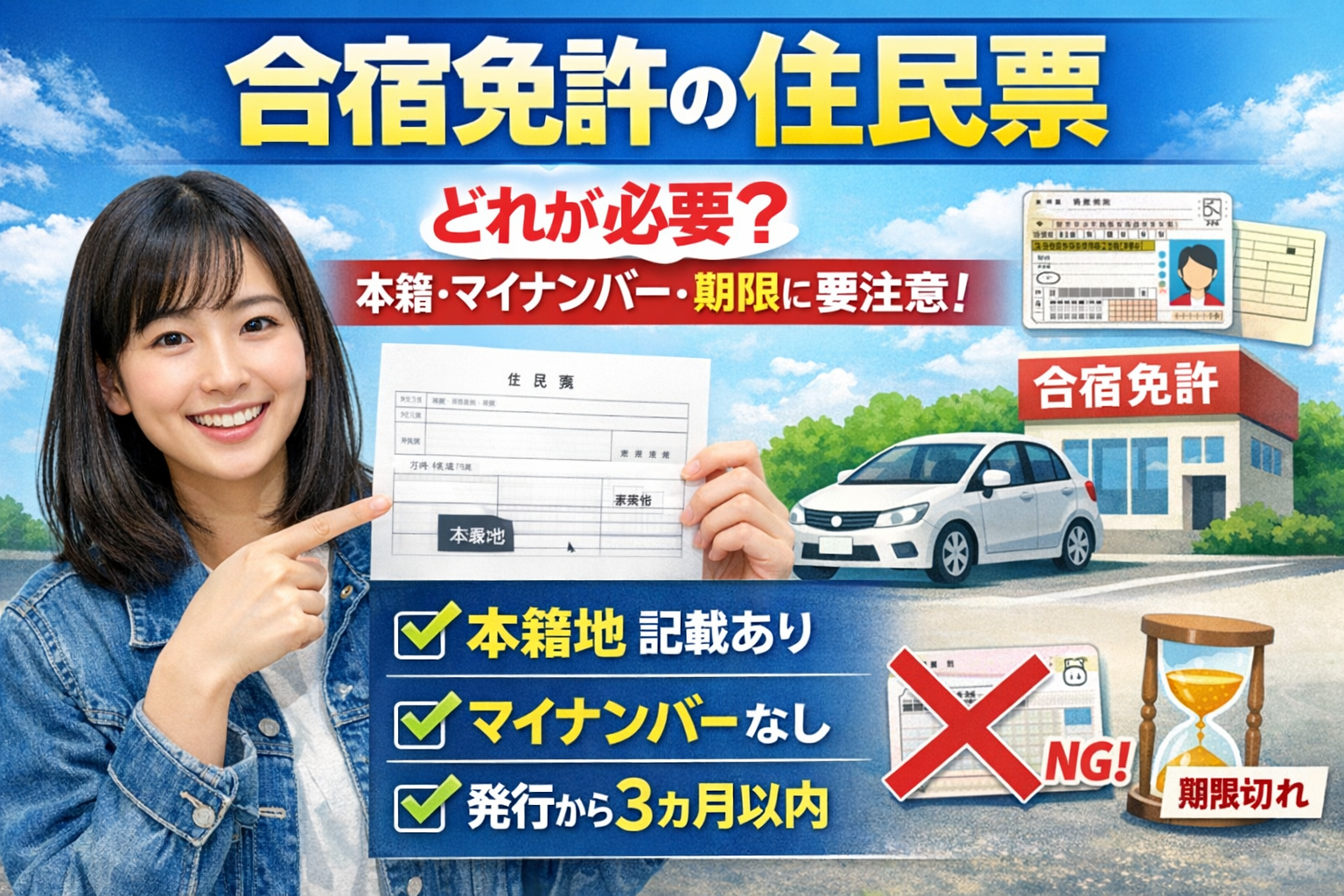 2026.01.24合宿免許の住民票、どれが必要?|本籍/マイナンバー/期限を間違えない合宿免許の申込みはスムーズなのに、入校直前になって「住民票が違う」「本籍が載ってない」「期限切れ」で慌てる人は意外と多いです。 住民票は、免許取得の手続きで“本人確認”や“本籍確認”に使われる重要書...