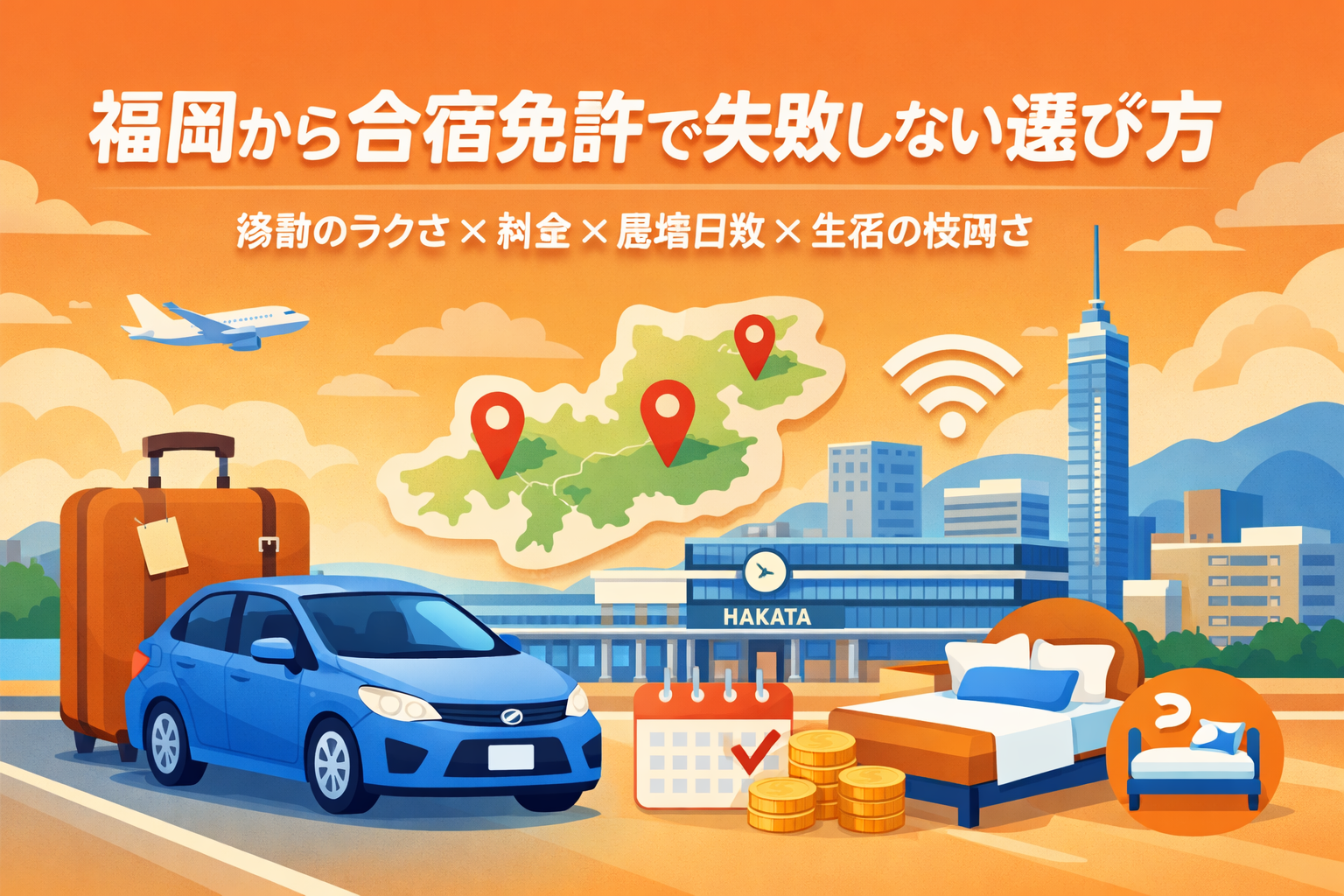 福岡から合宿免許を選ぶなら、まず行きやすさ(移動のラクさ)で土台を作り、そこに料金・最短日数・生活の快適さを重ねていくのが正解です。